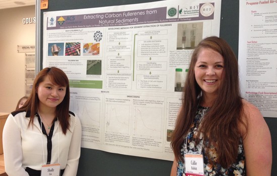 Shally Lin, left, a senior at Pittsford-Mendon High School, presented her research on environmental impacts of nanomaterials at the RIT Undergraduate Research Symposium on Aug. 14. Lin worked closely with her mentor, Callie Babbitt, associate professor in RIT’s Golisano Institute for Sustainability, during a summer internship through the American Chemical Society Project SEED Program.