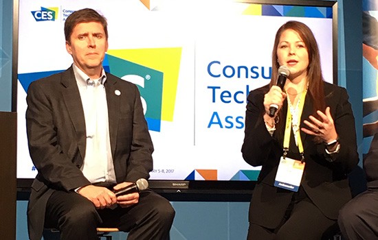 Callie Babbitt, right, associate professor in the Golisano Institute for Sustainability, with Walter Alcorn, vice president for environmental affairs and industry sustainability at the Consumer Technology Association, presents initial results of a comprehensive materials baseline study for all consumer electronics sold into the U.S. market for the past 25 years at CES on Jan. 7.