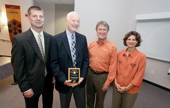 Professor emeritus Jake Shealy, second from left, was recently inducted in the Industrial and Systems Engineering Academy. He is shown here with Scott Grasman, left, Industrial and Systems Engineering department head; Harvey Palmer, dean of the Kate Gleason College of Engineering; and Jacqueline Mozrall, right, associate dean of the engineering college.