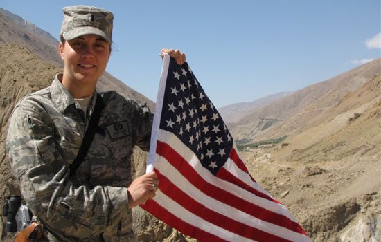 RIT and Air Force ROTC graduate First Lt. Kathryn Miles proudly displays an American flag during her deployment in the northern mountain region of Panjshir Province in Afghanistan. She recently received the Sijan Award, one of the military’s highest honors, for leadership.
