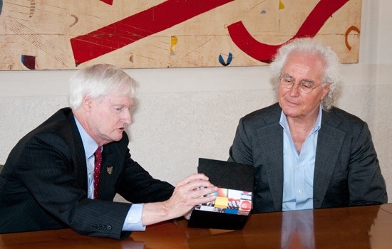 RIT President Bill Destler (left) shows photographs of the new Vignelli Center for Design Studies to Luciano Benetton, chairman of the Benetton Group. Destler met with Benetton in Treviso, Italy, to discuss a new educational partnership.