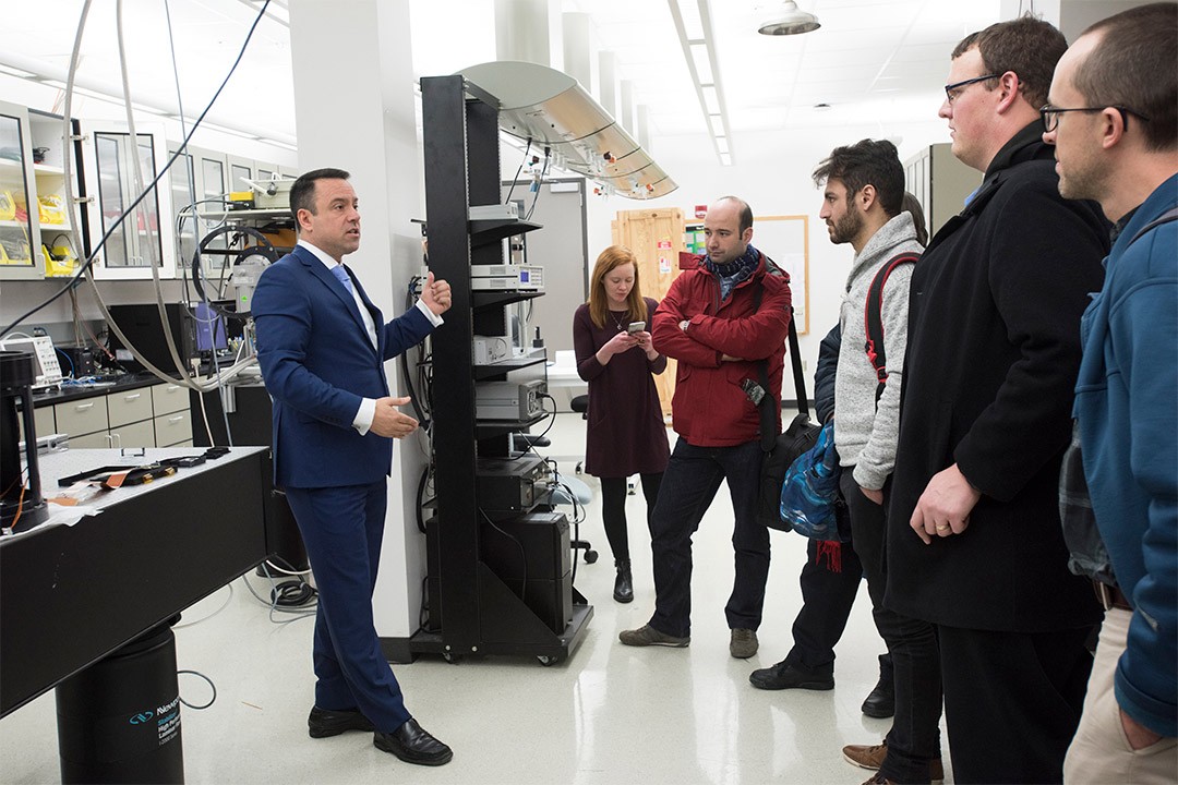 Don Figer, left, provides a tour of the Center for Detectors laboratory during the Photonics for Quantum 2019 event.