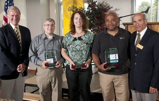 Sean Bennett (second from right), assistant dean for undergraduate academic affairs in the College of Applied Science and Technology, was one of four Clarkson University alumni to received the Woodstock Award during the its annual reunion weekend. He is joined by (left to right) Clarkson University President Tony Collins, Ronald Ayers, Shannon Klabnik and Associate Vice President for Alumni Relations Steve Newkofsky.