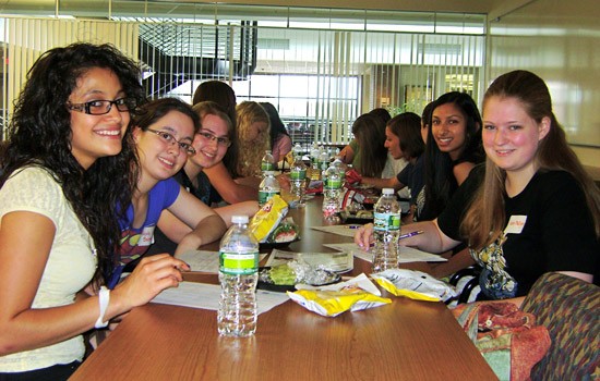 The Women in Technology Program welcomed prospective students, from left, Daisy Perez, Nicole Beinstein, Kristen Oliva, Nisha Gupta and Katie Mulligan to RIT during the recent College and Careers Day Program. WIT is one of several in-house academic support and social networks for all its female students.