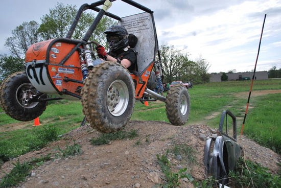 Mike Hargrave, a fifth-year mechanical engineering technology student, put the RIT Baja car through a test drive in preparation for its first competition in 2010 in South Carolina.