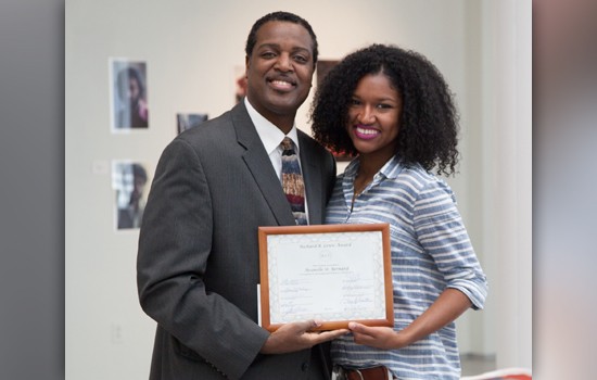 Lecturer Joe Williams with criminal justice major Avanelle St. Bernard of Brooklyn. St. Bernard received the Richard B. Lewis Award, for juniors with outstanding academic success.