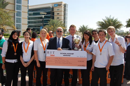 Members of the British Dubai Academy accept a scholarship award from Mustafa Abushagur, president of RIT Dubai, for winning the recent Dubai Challenge, a combination academic competition and engineering design event.