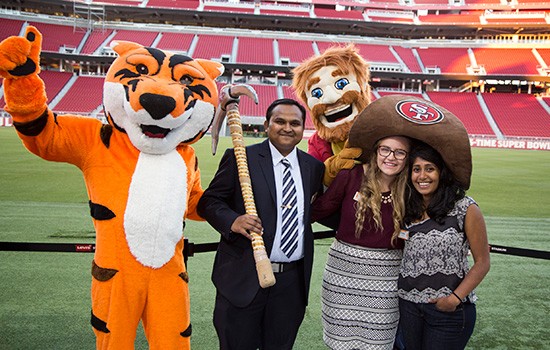 RIT mascot Ritchie hams it up with Sourdough Sam, the San Francisco 49ers mascot, as well as Hrushikesh Sagar ’14, Student Government President Andrea Shaver and Sneha Koka ’12 at Levi Stadium in Santa Clara, Calif. An 82-member delegation from RIT held strategic meetings with global high-tech companies from July 20 to 23. RIT also met with several hundred alumni on the trip, including Sagar and Koka, who work at Tesla Motors.
