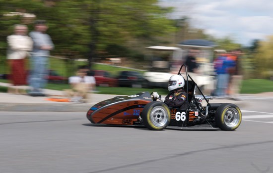 The RIT SAE Formula Car raced around Simone Circle when it was unveiled during the Imagine RIT Festival on May 2. The Formula team participated in its first competition at the Michigan International Speedway recently.
