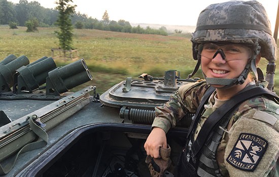 Phylicia Matusz takes a break during summer training in Vilseck, Germany, as part of the RIT Army ROTC program. She will graduate with a degree in biomedical sciences, and be stationed at Ft. Rucker, Alabama attending flight school.