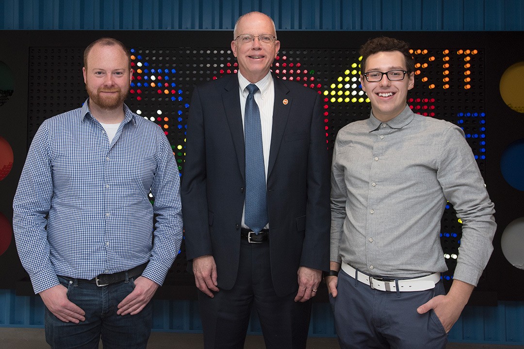 RIT student and CEO of Connexus Brandon Hudson is the first recipient of the new Gap Year Entrepreneurship Fellowship. The program allows students to take a year to focus on their growing enterprise, while RIT supports with finances, mentoring and progress toward a degree. Hudson, right, met with RIT President David Munson, center, and Austin McChord ’09 (bioinformatics), left, to be honored with the new fellowship.