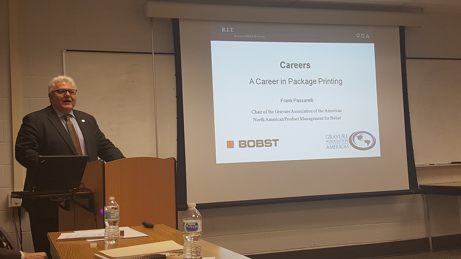 Passarelli, whose long career has spanned many facets of the industry, enlightened students in a discussion about his career trajectory in graphic communications. Like Eller, Passarelli is passionate about the gravure print process and believes it will likely realize an increase in market share thanks to the superior production quality inherent in the process. He encouraged students to explore careers in the industry while hoping to inspire them with his own story.