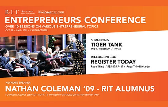 As part of the conference, attendees and the RIT campus community can watch students participate in the Tiger Tank competition semi-finals, 10 a.m. in Ingle Auditorium, Student Alumni Union.