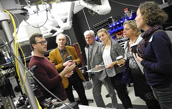 Members of the Silicon Europe Alliance, visiting New York state universities and companies recently, met with RIT microsystems associate professor Stefan Preble (far left) in the Nanophotonics Laboratory during a tour of the Kate Gleason College of Engineering. (left to right) Johan Lecocq (Leuven, Belgium), Paolo Piccinelli (Italy), Nadja Dehne (Dresden, Germany), Veronique Pequignat (Grenoble, France), Constance Motte (Grenoble, France).