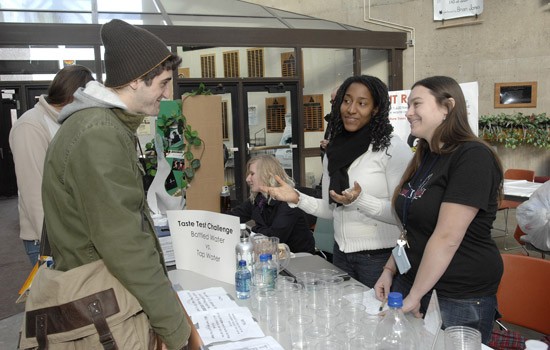 Vito Morbidini, left, second-year industrial design student, takes part in the Taste Test Challenge during RIT’s National Teach-In on Global Warming. Nevin Byrd, center, and Summer Naugle, members of the Student Environmental Action League, administered the challenge to gage preferences between bottled and tap water. SEAL members claim four out of five participants prefer tap.