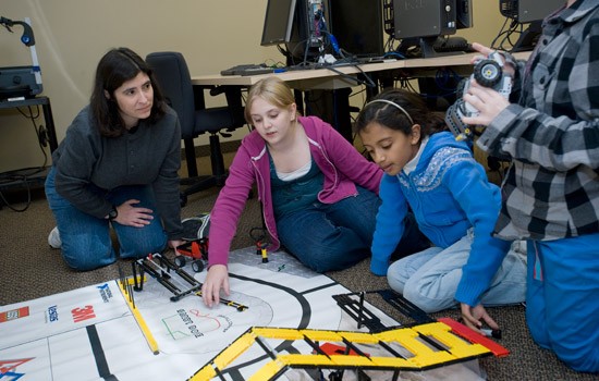 Stephanie Ludi, an RIT software engineering professor, works with the RIT-led FIRST LEGO League team as it practices for its first competition this Saturday at Chuchvile-Chili middle school. The team, which is comprised entirely of middle school-aged girls, was put together by Ludi to encourage girls to get involved in computing and engineering.