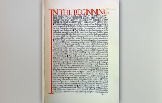 The Doves Press edition of the King James Bible, The English Bible Containing the Old Testament & the New. Hammersmith, England: 1903-1905. Designed to reflect 15th-Century Venetian printing, this Bible has little ornamentation, letting the text speak for itself through an elegant typeface. The type’s designer and founder of Doves Press, T.J. Cobden-Sanderson, is as famous for his type design as what he eventually did with his type. In 1916 he threw his type and the punches and matrices used to make it into the River Thames—a dramatic end to the Doves Press.