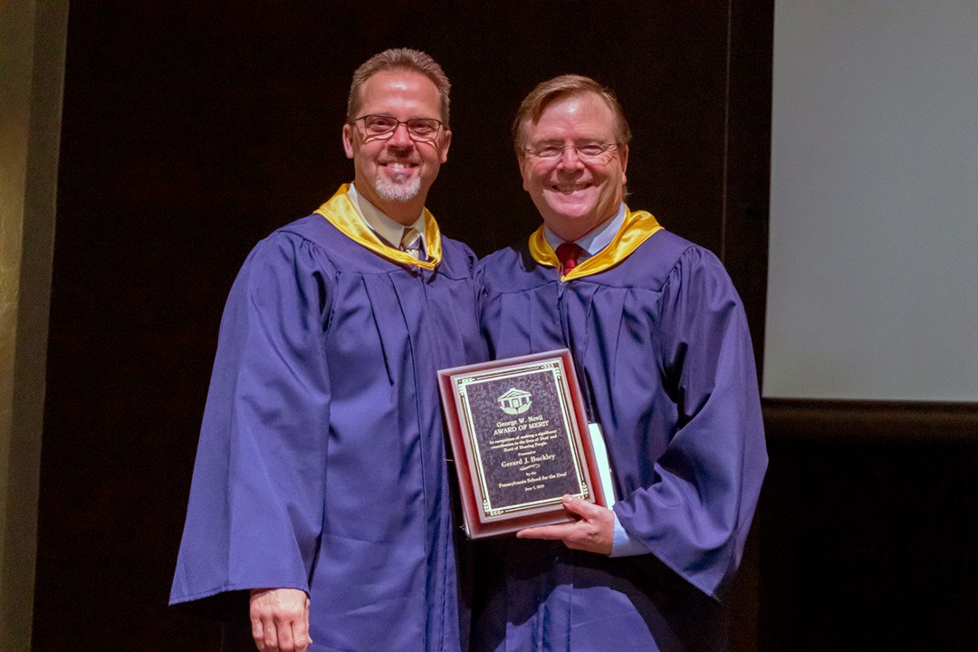 Gerard Buckley, president of Rochester Institute of Technology’s National Technical Institute for the Deaf, received the George W. Nevil Award of Merit at the graduation ceremony for students of the Pennsylvania School for the Deaf (PSD) in Philadelphia.
