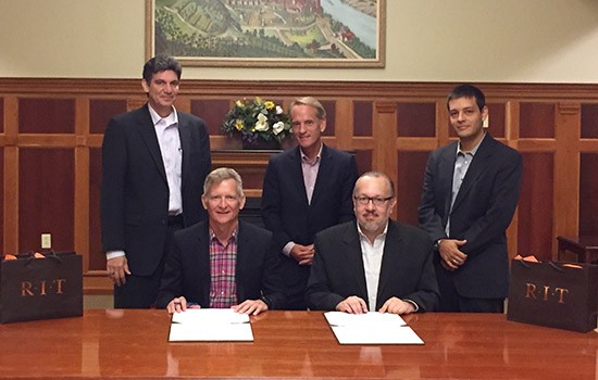 RIT expanded its academic and research collaborations with the Universidad Autonoma de Occidente, during a campus ceremony recently. Attending the event are (left to right) Marcos Esterman, associate professor, industrial and systems engineering and RIT Faculty Associate to the Provost for AALANA Faculty; RIT Provost Jeremy Haefner; James Myers, associate provost, International Education and Global Programs; Freddy Naranjo, Decano Facultad de Ingenieria, Universidad Autonoma de Occidente; and Alvaro Rojas Arciniegas ’08, ’13 (industrial engineering, imaging science), Profesor Asociado, Departamento de Automatica y Electronica.