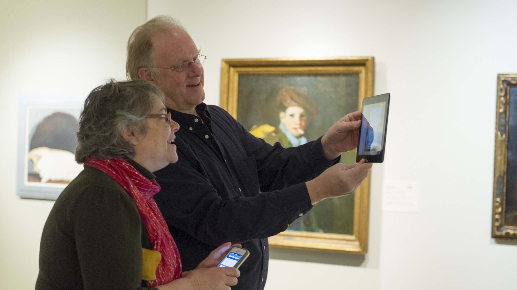 Lakin’s and Halbstein’s exhibit contains augmented reality experiences that bring select paintings in MAG’s permanent collection to life. By downloading and using an Aurasma-powered app designed by Lakin, “The Collaborative Composite Image” (CCI), certain artworks become animated by viewing them through a phone camera.