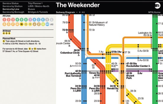 But all was not lost, according to Vignelli Transit Maps. In 2008, Vignelli took up an offer to print the New York subway map as a limited-edition art piece for a benefit. It was a success, and in 2011, the Metropolitan Transportation Authority asked the Vignelli design team to update and adapt the 2008 diagram for The Weekender, a Web feature that instantaneously conveys transportation changes to riders about subway service during weekends.