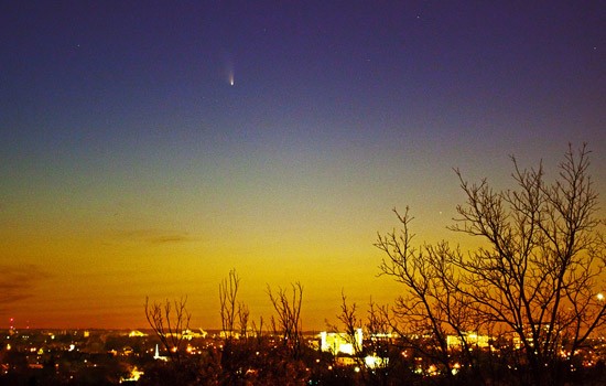 Swartzlander set up his Canon 5D II camera at Cobbs Hill Park and took a four-second exposure with his 100-millimeter lens at 8:30 p.m. on Sunday, March 17, recording the comet and a clear evening sky in Rochester.