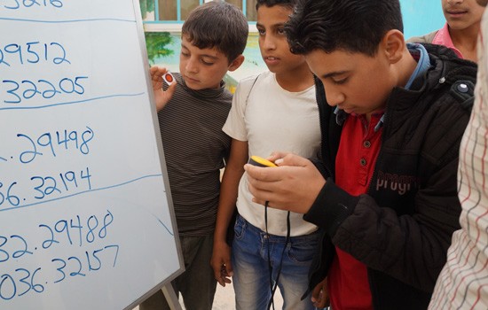 RIT assistant professor Brian Tomaszewski plays a geocaching game with residents of the Za’atari Syrian refugee camp in Jordan. The professor is conducting some of the first research on the situation awareness and spatial thinking skills of refugees in a camp environment.