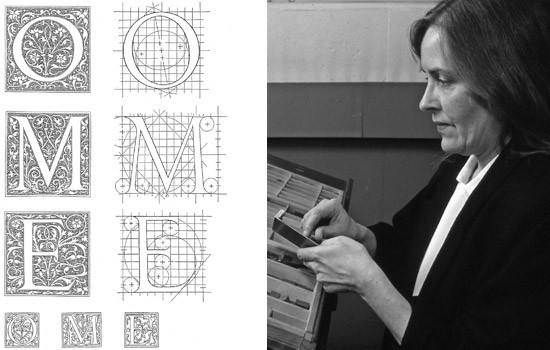Master typographer and historian Kay Amert, at right, had been studying Parisian printer Simon de Colines (1480-1546) and his contributions to the modernization of book design until her death in 2008. Robert Bringhurst has brought Amert’s writings all together in The Scythe and the Rabbit: Simon de Colines and the Culture of the Book in Renaissance Paris, published by Cary Graphic Arts Press. In the image on the left, three of the decorated initials used by Colines and Robert Estienne from 1527. Center, corresponding model letters from Tory’s Champ fleury (Paris, 1529). Lower row, the corresponding lettres fleuries from Champ fleury.