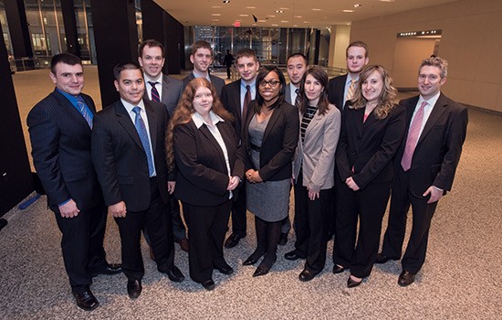 Some of the RIT graduates at JPMorgan Chase & Co. Back row, from left: Stephen Hutsal, Russell Baker, Aaron St. John, Richard Dararaksmey and Daniel Martin. Front row, from left: Brian Call, Shane Osaki, Jessica Peters, Brittany Ray, Dina Muscanell, Alana Malina and Jeremy Edman.