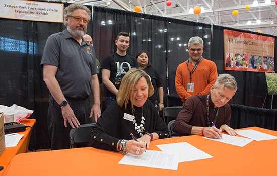 Seneca Park Zoo Society Executive Director Pamela Reed Sanchez, left, and RIT Provost and Senior Vice President for Academic Affairs Jeremy Haefner sign a memorandum of understanding in a partnership to benefit the Zoo Society and RIT students and faculty.