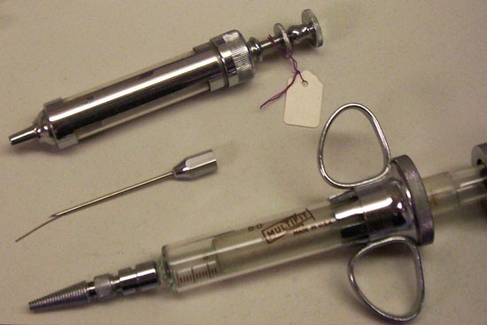Medical tools on display include a collection of hypodermic needles dating back to the late 1800s.