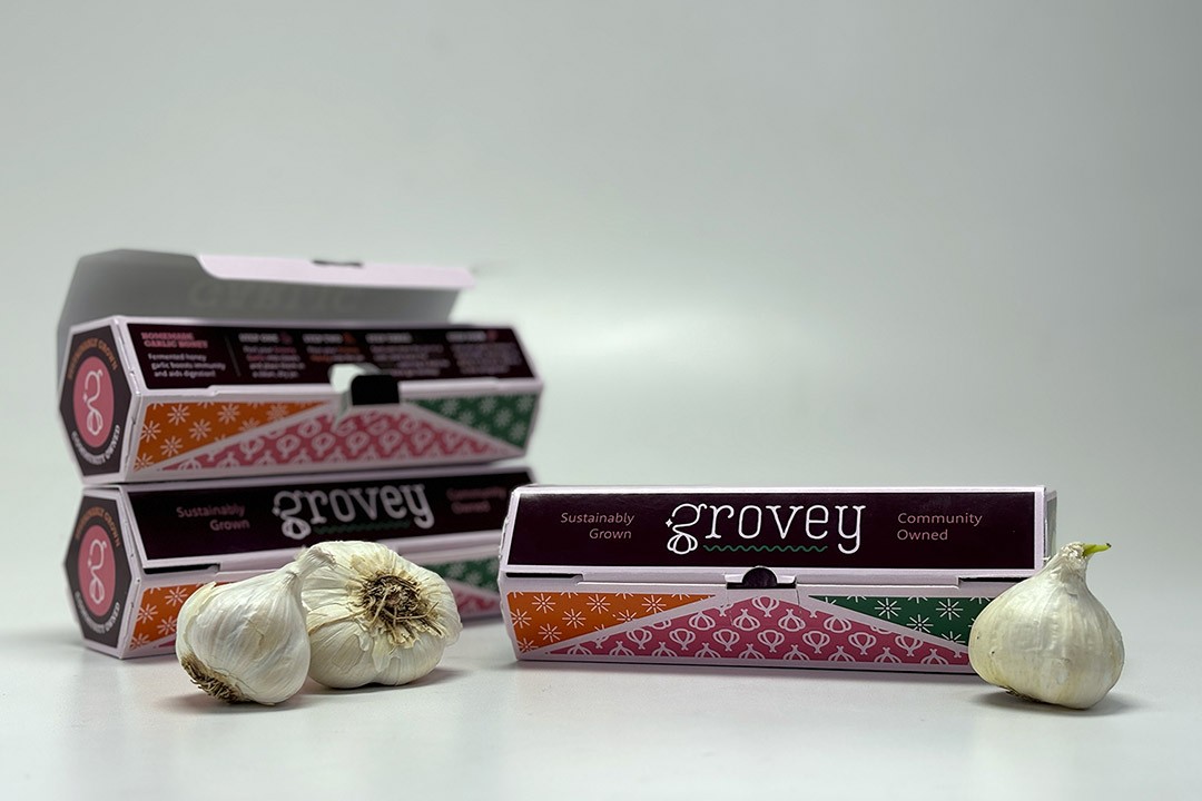 Grovey Garlic was developed during the previous spring semester course Packaging Design that combines concepts of technology, art, and design, as well as real-world problem solving. Design requirements for the 2024 challenge were to create sustainable paperboard packaging for a fresh produce product that is not typically packaged in this type of material.