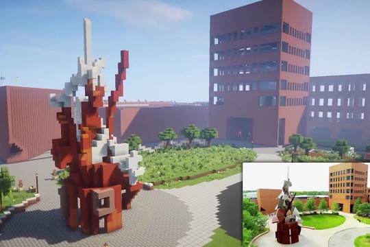 The project picked up speed after RIT was affected by the COVID-19 pandemic in mid-March. The game Minecraft allows multiple players to collaborate on building structures and designing landscapes, including recreating physical places.