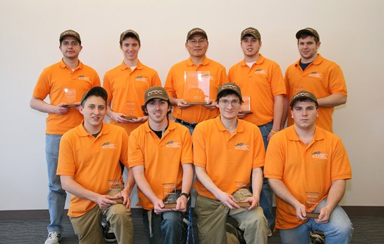 RIT took first place in the Northeast Collegiate Cyber Defense Competition March 9-11. The RIT team is made up of (front row, from left) Neil Zimmerman, Christopher Bower, Jeremy Pollard, Corey Sinay, (back row, from left) Lucas Duffey, Griffith Chaffee, coach Bo Yuan, Brandon Myers and Cory Baker.