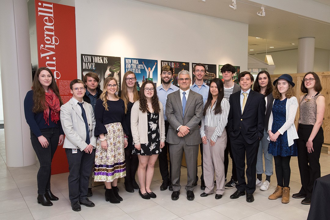 Some of the winners of 2019 writing awards, with RIT College of Liberal Arts Dean James Winebrake, center.