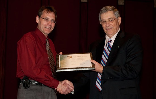 Jeff Rogers (left), assistant professor in the civil engineering technology/ environmental management and safety program, received a certificate recognizing the accreditation of the graduate facility management degree program from the International Facility Management Association in November.