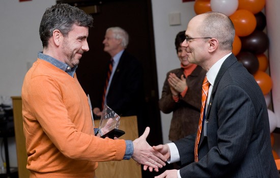 David Bond (right), director of sponsored research services, congratulates Peter Hauser, NTID associate professor for research and teacher education, at a ceremony in February recognizing RIT’s “PI Millionaires.” President Bill Destler is in the background. The group was honored at an April 13 dinner, sponsored by the Office of the President.