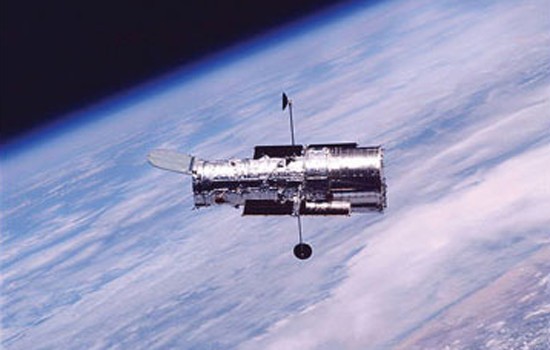 NASA’s Hubble Space Telescope sweeps around the Earth once every 97 minutes. This picture shows Hubble floating above Earth during a servicing mission 3B, March 2002.