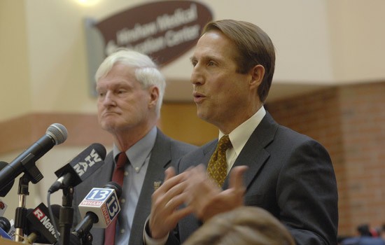 Mark Clement, CEO of Rochester General Health System (right), and RIT President Bill Destler announced a strategic alliance between RIT and RGHS at a Dec. 18 news conference.