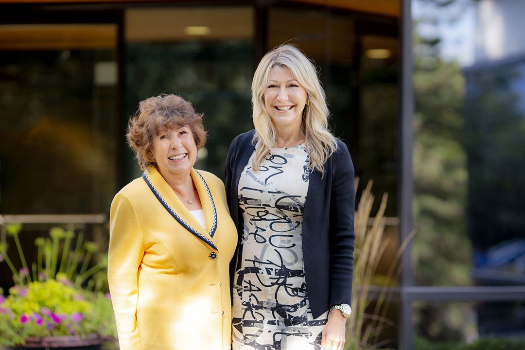 Brigitte Gueldenpfennig (left) and Dinah Gueldenpfennig Weisberg outside REDCOM Laboratories in Victor, N.Y. The family, including Klaus Gueldenpfennig (posthumously), will be honored with the Phil Saunders College of Philanthropy Award during Brick City Weekend in October.