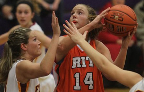 Courtney Tennant (No. 14) in the 2012 Wendy’s College Classic women’s basketball game between RIT and St. John Fisher College.