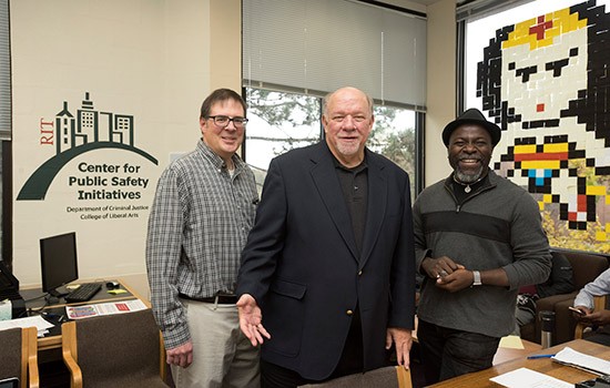 Criminal Justice Department Chairperson John McCluskey, left, Center for Public Safety Initiatives Director John Klofas and Ernest Fokoué, an associate professor in RIT’s School of Mathematical Sciences, announce a $5,000-top prize competition for interdisciplinary teams of students to come up with STEAM-related solutions to public safety problems.