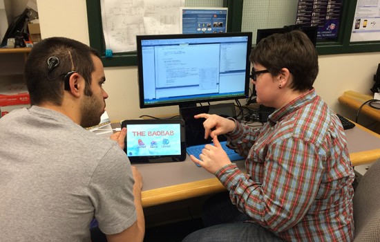 Chris Santoro and recent graduate Kelley Duran work on “The Baobab” application in NTID’s Center for Access Technology.