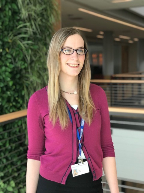 Leah Przybylski standing in front of green wall at RIT's Golisano Institute for Sustainability