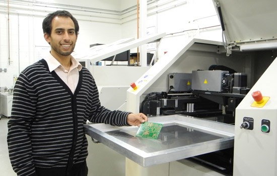 Andrew Daya, a graduate student and research assistant in the Center for Electronic Manufacturing and Assembly, explains the process of integrating electronic components onto printed circuit boards.