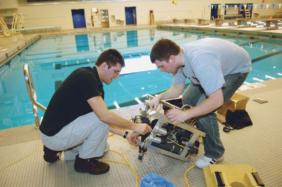 Dan Scoville ’05, left, and Matt Paluch ’06 prepare to test a remote-operated vehicle in Judson Pool in the Gordon Field House and Activities Center. The device, designed and built for an engineering senior design project, has since been used to explore Lake Ontario shipwrecks.