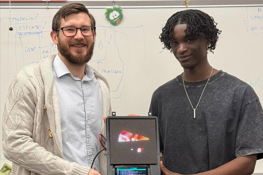 Professor Micheal Zuzak, left, and Renaaron Ellis worked together to build a gamified hardware platform to help students learn about techniques to discover and prevent online exploits.