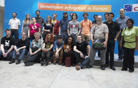 The RIT group stands at the German Christian Democratic Union building—also known as CDU, one of the largest political parties in Germany—where they met with politicians who talked about their views on video games in Germany. The two-week study abroad program introduced students to game design and development in Germany.