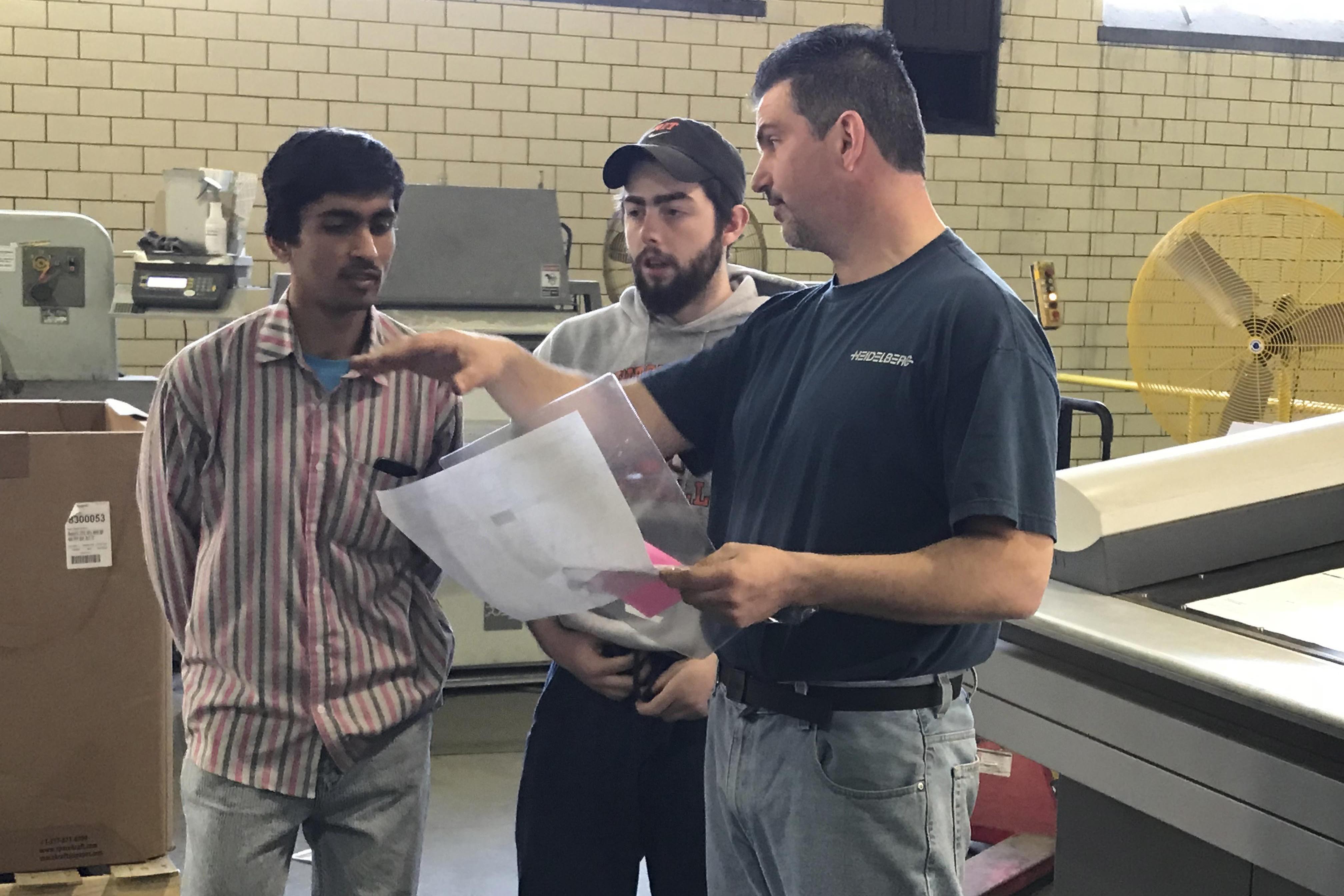 School of Media students Chandramohan Setharamiah Srinivasaraju, left, and Tommy Hodgson, middle, receive instructions for Test Targets 11 presswork from a professional at TBN Direct.