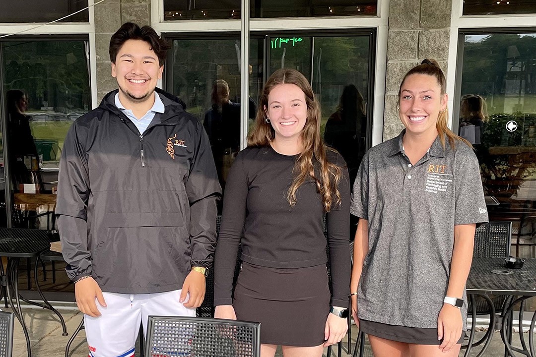 From left to right, Daniel Pinigin, Kassidy Burrows, and Baylee West at an Institute of Packaging Professionals alumni golf tournament. The three packaging science majors will present their research on essential oils in food packaging at the “Keep It Fresh” symposium on Sept. 29.